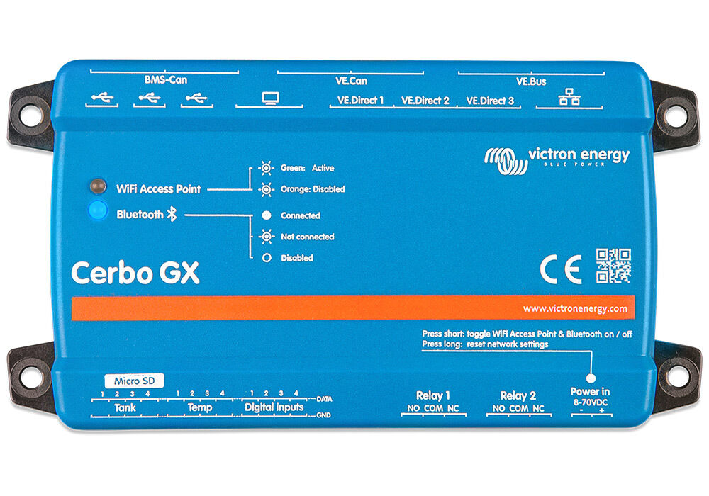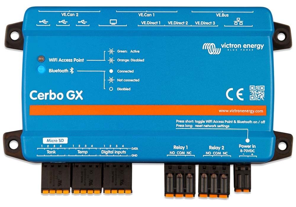 The Victron Cerbo GX MK2 is a next-generation system communication centre featuring dual CAN-bus ports, built-in Wi-Fi, Bluetooth, Ethernet and multiple connection.